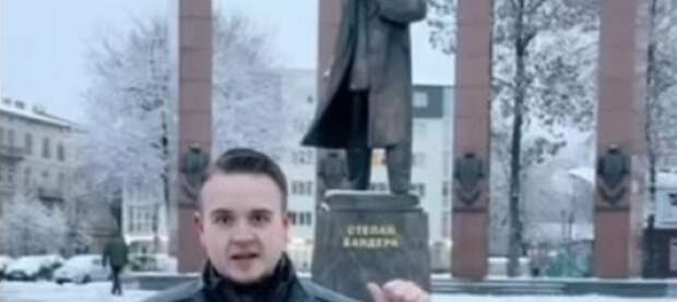 Польский политик Якуб Климас на фоне памятника Бандере во Львове призвал снести его